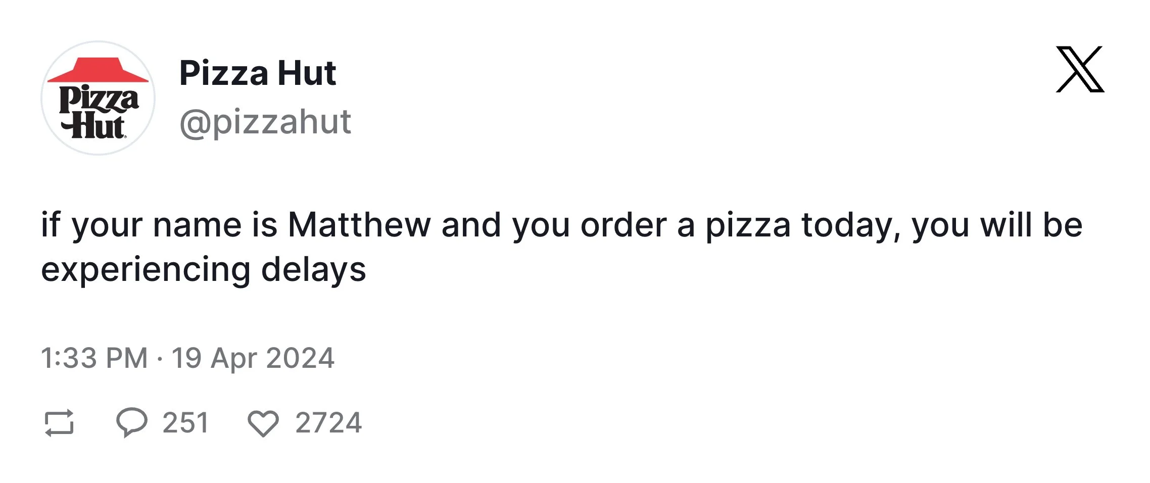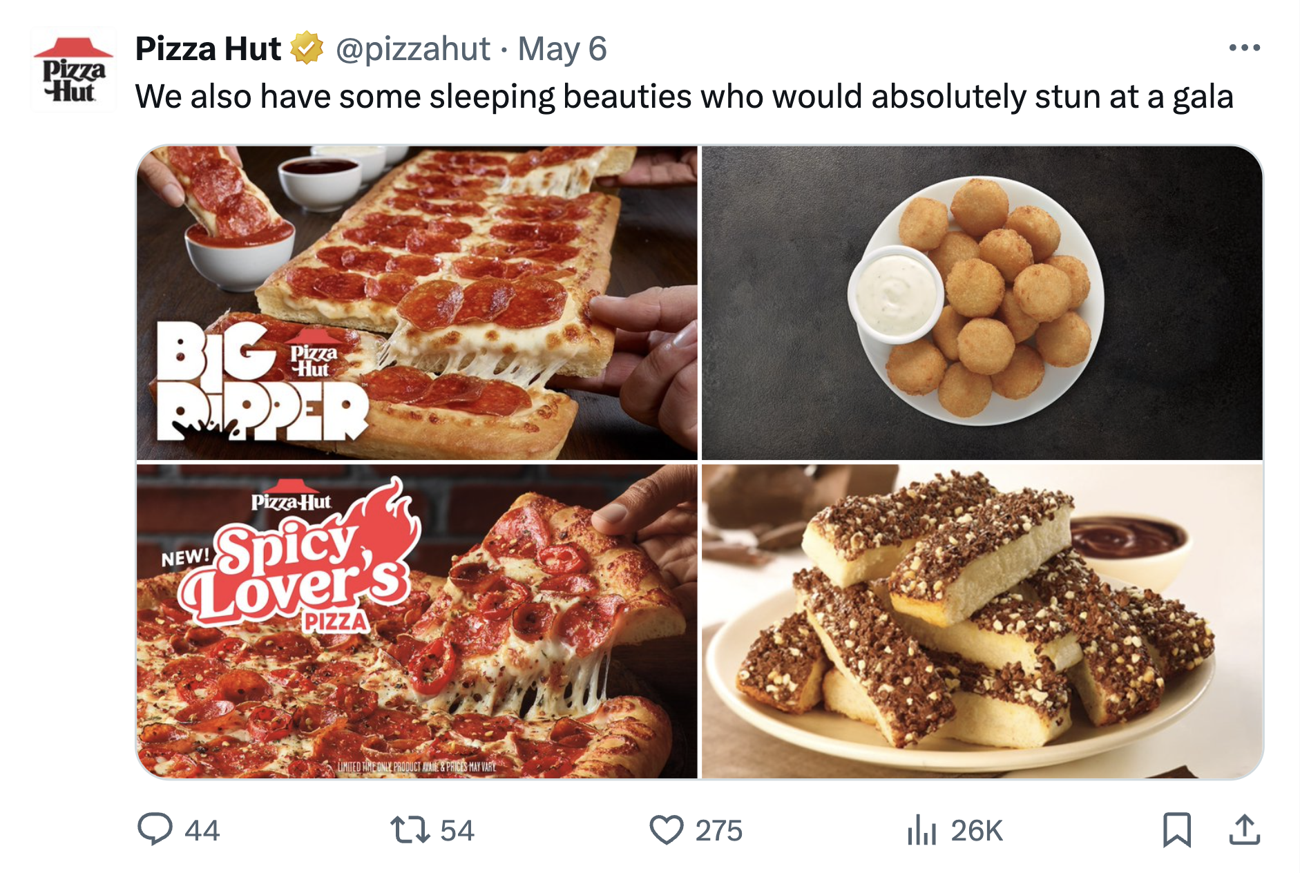 With Mischief as Pizza Hut’s social agency of record, I have had the opportunity to create work with some of the most brilliant people. I have learned so much about the importance of strategic thinking, creating unique content, and inventing brand personas. Pizza Hut’s strategy is about connecting people with the joy of pizza; we believe that if the content isn’t fun, then it isn’t worth it. I have had the most fun working alongside my copywriter partner to create the unhinged, beautiful chaos that is the world of Pizza Hut; from organic social posts to supporting activations with rollout plans, every piece of this work ties to one cohesive message: we are the most interesting pizza brand in the world, ready to take you on a joyride.